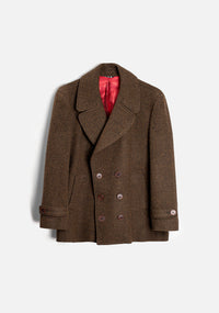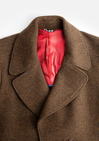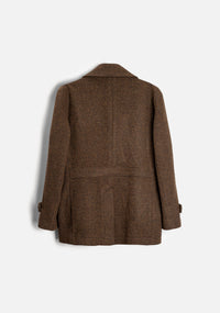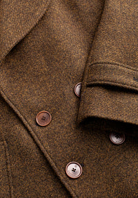 Este abrigo de paño color cafe jaspe tiene un diseño clásico y elegante. Cuenta con un cuello redondo con solapas unidas, lo que le da un toque cómodo. Es cruzado y cuenta con botones en ambos lados de la parte delantera, lo que permite mantener el calor en días fríos. Sus bolsillos añaden un toque extra de estilo y funcionalidad al abrigo.