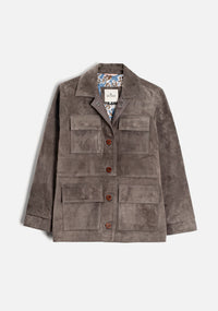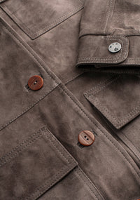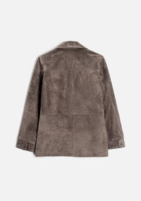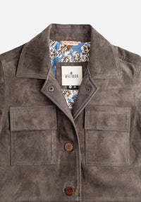 La chamarra Ruanda femenina, confeccionada en 100% gamuza, combina un diseño sofisticado con un aire práctico y versátil inspirado en el estilo safari. Su cuello camisero en punta y la botonadura de tagua se complementan con un broche adicional en la solapa, aportando detalles funcionales y elegantes.