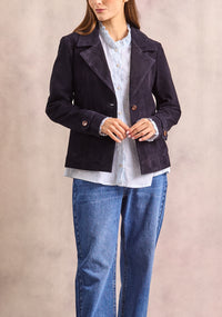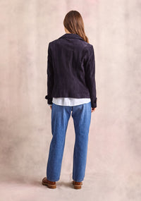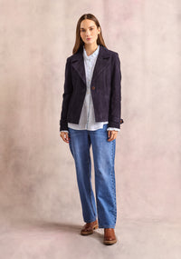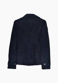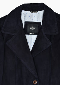 La chamarra Elioth en gamuza azul con solapa en punta combina un estilo clásico con un toque moderno y audaz. Es una prenda versátil que puede complementar tanto looks casuales como más atractivos.