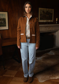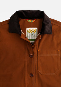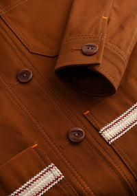 Confeccionada en algodón orgánico, la Chamarra Gretta combina la sencillez del diseño utilitario con detalles que evocan sofisticación artesanal. Su cuello camisero en pana de algodón aporta un contraste cálido y táctil, mientras los bolsillos de líneas definidas, decorados con una delicada cinta ornamental, añaden un toque artístico y funcional.